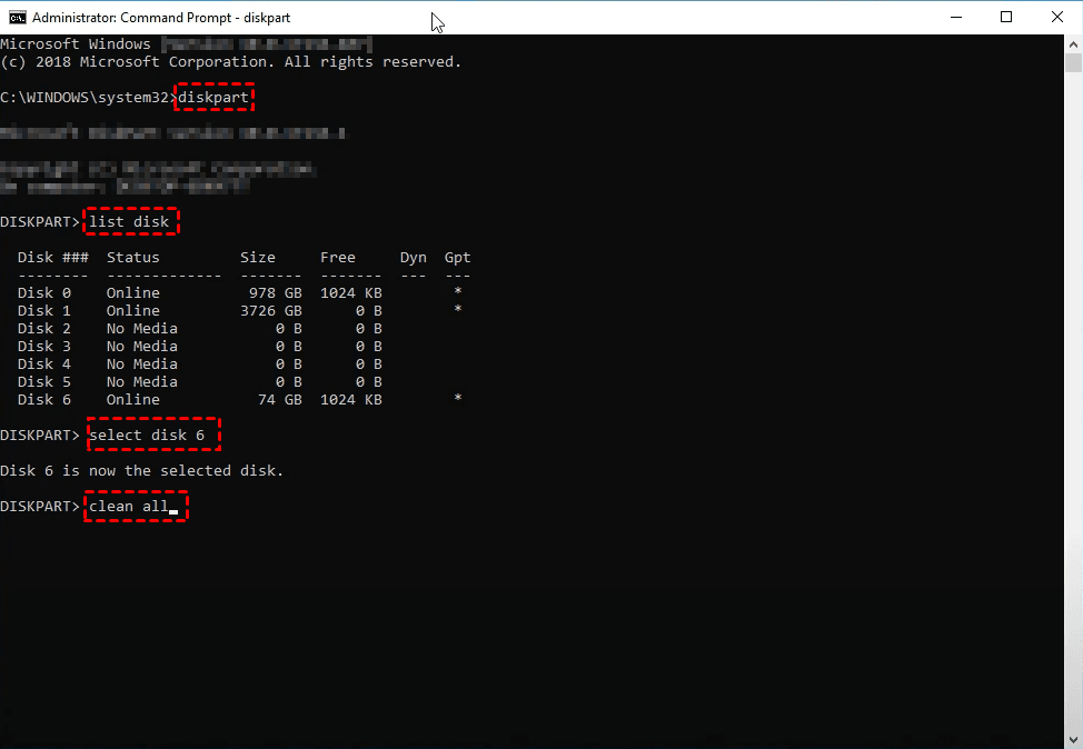 DiskPart le da opciones para formatear o limpiar una unidad, aquí voy a introducir el comando clean ya que es una forma más segura de borrar los datos. Pero tenga en cuenta que si utiliza el comando "clean" en la última línea, no borrará la unidad USB por completo, y los datos todavía se pueden recuperar.