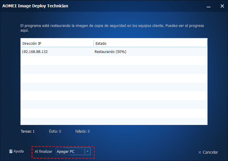 Eso es todo el proceso de despliegue de la imagen de Windows 10 en múltiples ordenadores. Ahora puede ver el progreso del despliegue de la imagen de cada ordenador cliente en este software. Y puede preestablecer la operación al finalizar, incluyendo Apagar PC y Reiniciar PC.