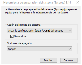 Pulse "Win + R" e introduzca "sysprep" en el cuadro de texto para encontrar Sysprep.exe. Ejecútelo y elija Introducir OOBE del sistema, marque la opción Generalizar y seleccione Apagar. Este paso es necesario para que los usuarios eviten problemas de compatibilidad después de la implantación.