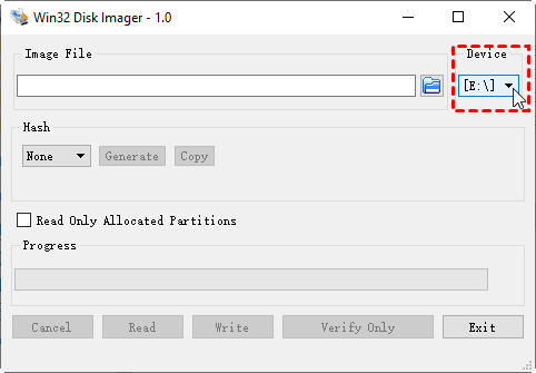 - Inicia Win32 Disk Imager, elige la letra de unidad de tu tarjeta SD (aquí es E:\) en "Device".
