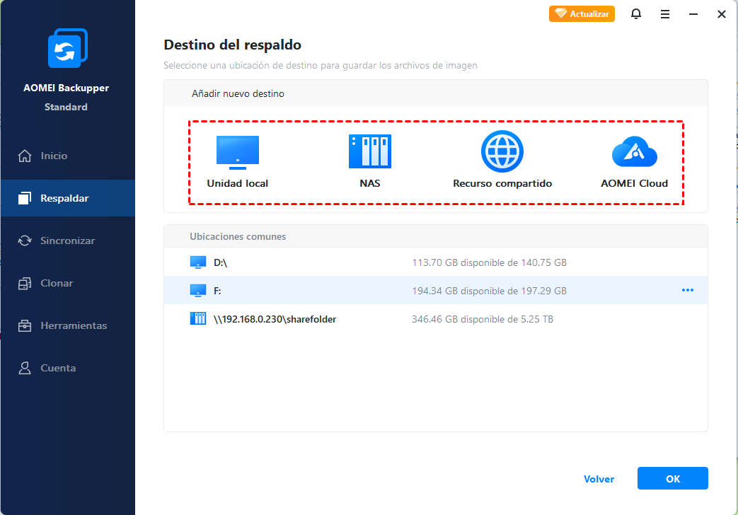 ◈ Permite realizar copias de seguridad en varias ubicaciones, como discos locales, discos duros externos, unidades flash USB, dispositivos NAS y ubicación de red.