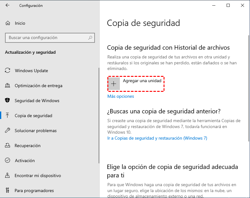 1. Busque la configuración de copia de seguridad y selecciónela. A continuación, haga clic en la opción Agregar una unidad en Copia de seguridad con el historial de archivos y seleccione el disco duro externo que ha conectado.