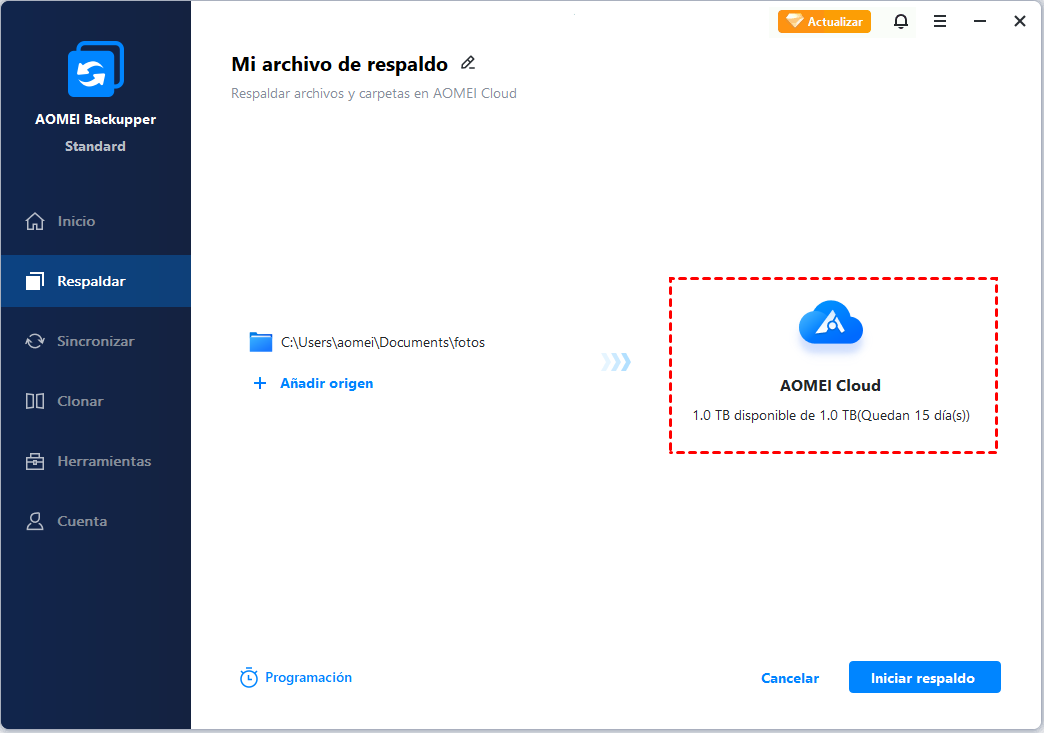 Consejo importante: Con la función de Sincronización o Copia de Seguridad, puedes copiar archivos a múltiples ubicaciones automáticamente. Entre ellas, las unidades en la nube son una de las opciones más populares, pero paradójicamente casi todas las unidades en la nube sólo ofrecen unos pocos gigabytes de almacenamiento gratuito en la nube, mientras que los usuarios necesitan sincronizar o hacer copias de seguridad de un gran número de archivos o carpetas. En este caso, prueba Respaldo en la nube, obtendrás 1TB de almacenamiento en la nube, con un periodo de prueba de 15 días.