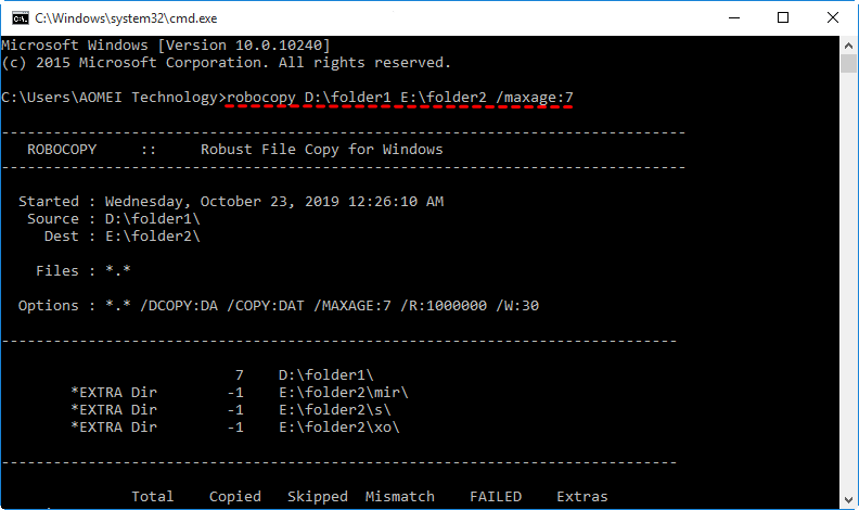 robocopy D:\folder1 E:\folder2 /s /maxage:7 o robocopy D:\folder1 E:\folder2 /XO /s /maxage:7