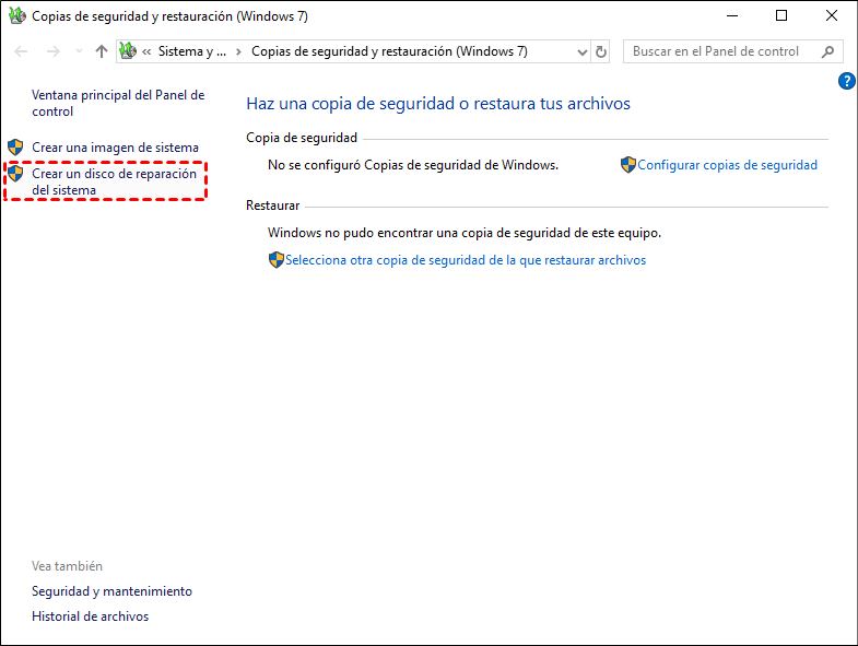 Forma 2: Crear disco de reparación del sistema en Windows 10/11 utilizando Copia de seguridad y restauración