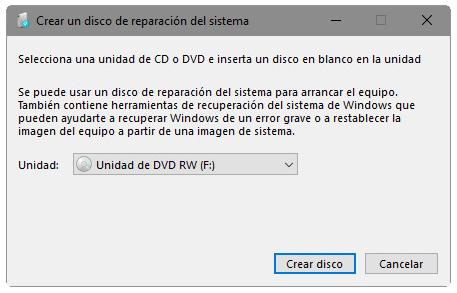 Como se mencionó anteriormente, puedes crear un disco de reparación de Windows 10 utilizando un CD/DVD, y también se puede hacer con la utilidad incorporada de Windows.