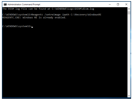 2. Abra un símbolo del sistema elevado, escriba Reagentc /setosimage /path D:\Windows-OS-image /index 1 y pulse Intro.