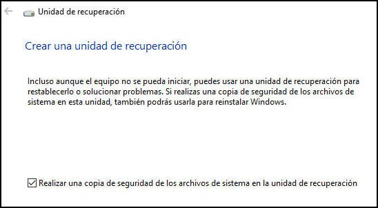 Nota: La opción "Copia de seguridad de los archivos del sistema en la unidad de recuperación" creará una unidad de recuperación que le permitirá reinstalar Windows.