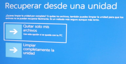 4. Tome como ejemplo "Recuperar de una unidad", haga clic en él. A continuación, seleccione "Quitar solo mis archivos" para eliminar sólo los archivos de su ordenador. Si desea reciclar completamente este sistema operativo, puede elegir "Limpiar completamente la unidad".