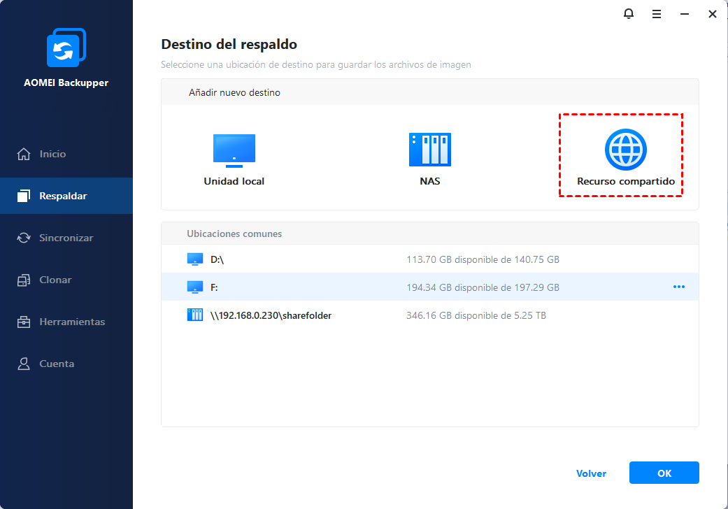 - Se le permite guardar imágenes de copia de seguridad en un disco local, disco duro externo, recurso compartido de red o dispositivo NAS, etc.