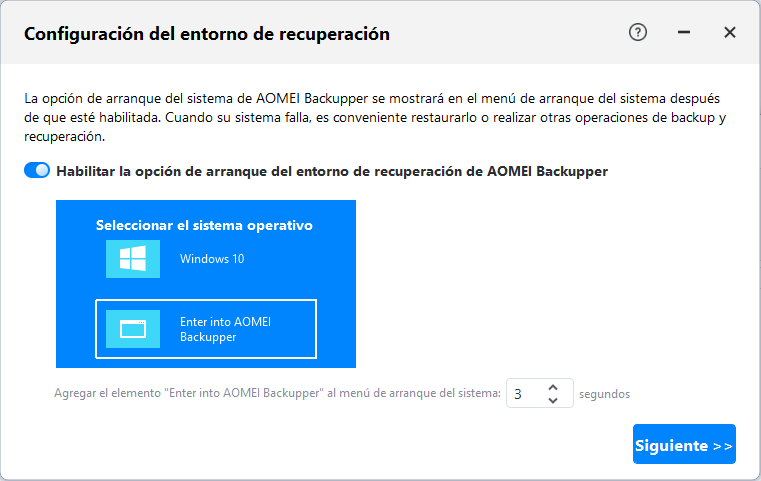 - También puede crear un entorno de recuperación en AOMEI Backupper Professional. Una vez creado y habilitado el entorno de recuperación, la opción "Entorno de recuperación de AOMEI Backupper" se añadirá a la página del menú de arranque del sistema para que pueda seleccionar iniciar el sistema desde el entorno de recuperación para restaurar la imagen ISO de Windows en el nuevo disco duro.