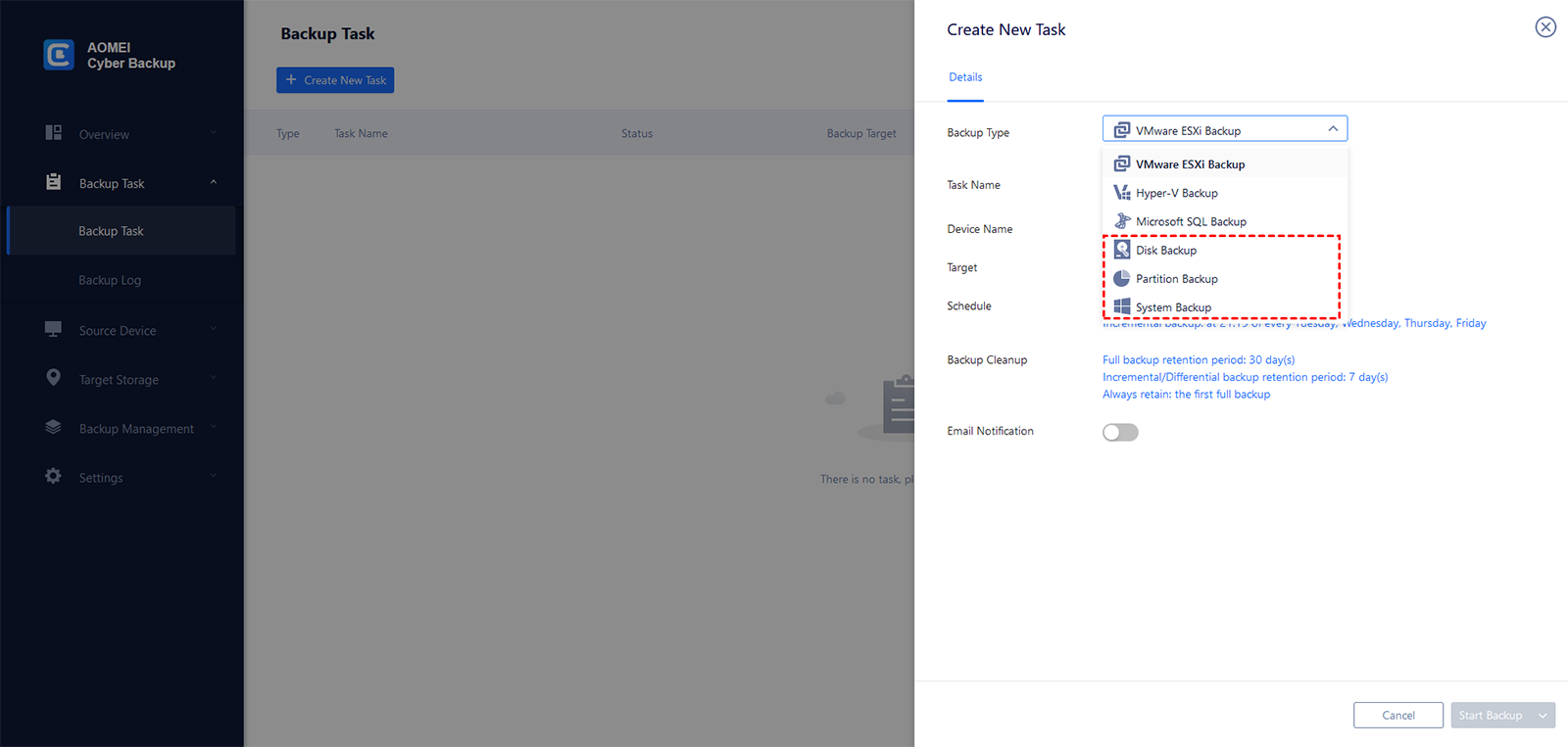 2. Haga clic en Tarea de copia de seguridad en la barra de menú izquierda y seleccione Tarea de copia de seguridad > Crear nueva tarea.