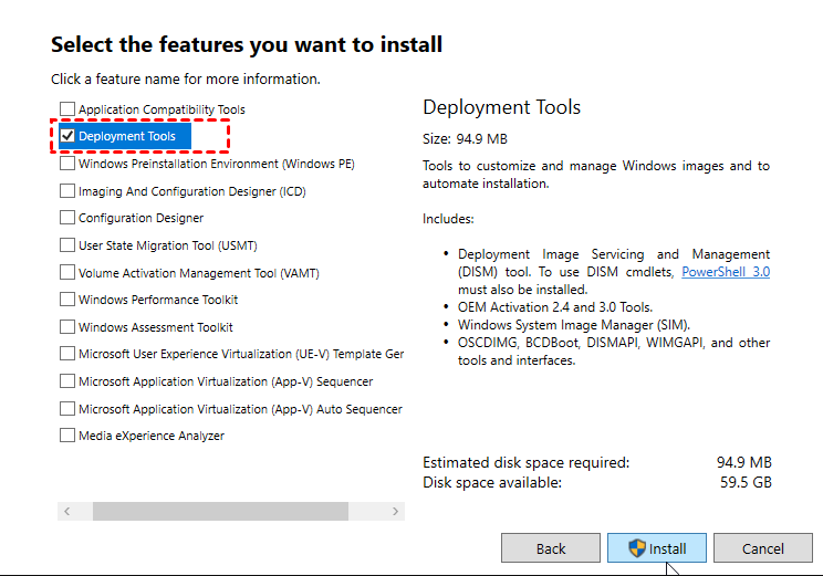 3. Descargue e instale el último kit de evaluación e implementación de Windows (ADK) para Windows 10. Sólo tiene que seleccionar Herramientas de despliegue para instalar.