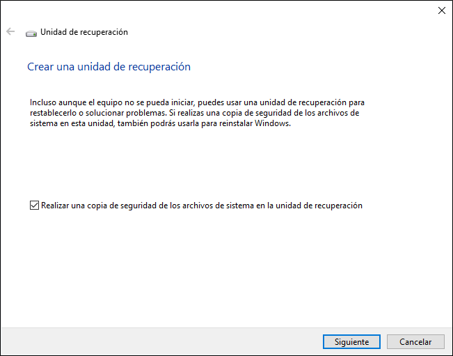 En esta utilidad, marca la opción "Realizar una copia de seguridad de los archivos desistema en la unidadde recuperación". Esto creará un disco de recuperación que te permitirá reinstalar Windows. Luego, sigue el asistente para seleccionar la unidad USB y comienza a crear el disco de recuperación de Windows.