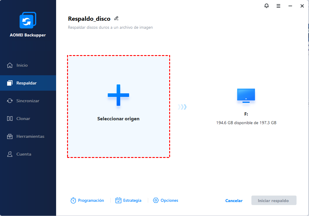 - Selecciona el lugar de destino donde planeas almacenar la imagen de respaldo. (Opcional) Y puedes verificar las opciones "Opciones", "Programación", "Estrategia" en la esquina izquierda.