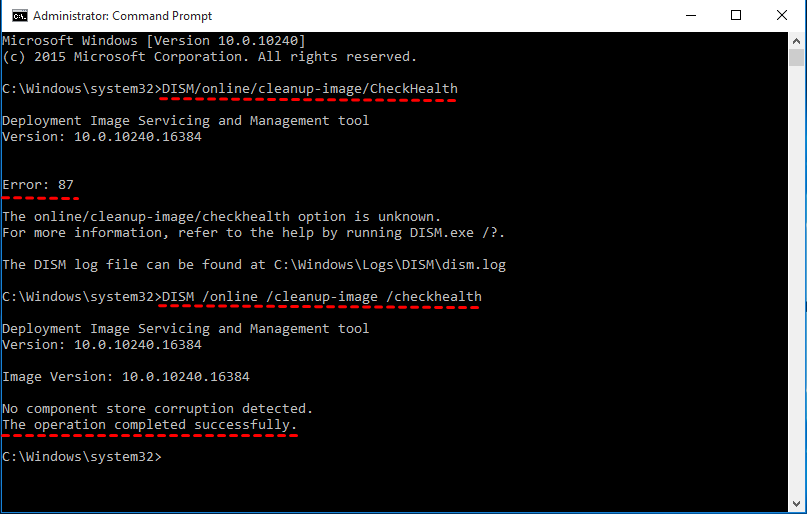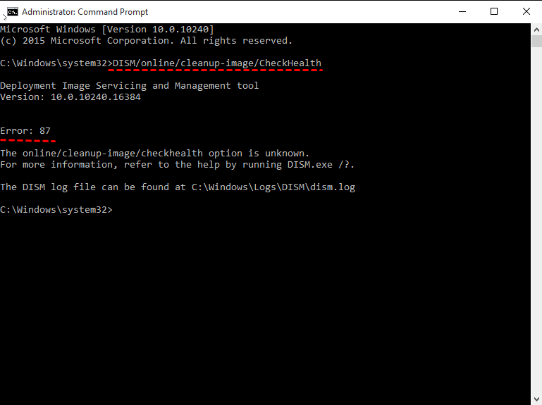 El error 87 de DISM: el parámetro es incorrecto puede ser el resultado de escribir un comando incorrecto al utilizar DISM /CheckHealth o DISM /ScanHealth. Por lo tanto, lo primero que hay que comprobar es si ha introducido los comandos correctamente.