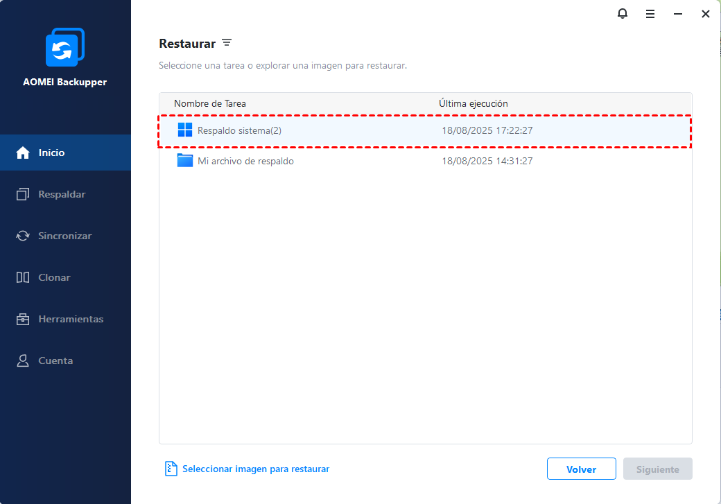 Inicie este software de nuevo, busque la tarea de copia de seguridad en la pestaña Inicio o vaya a la pestaña Restaurar, localice la imagen del sistema y siga el asistente para completar la operación.