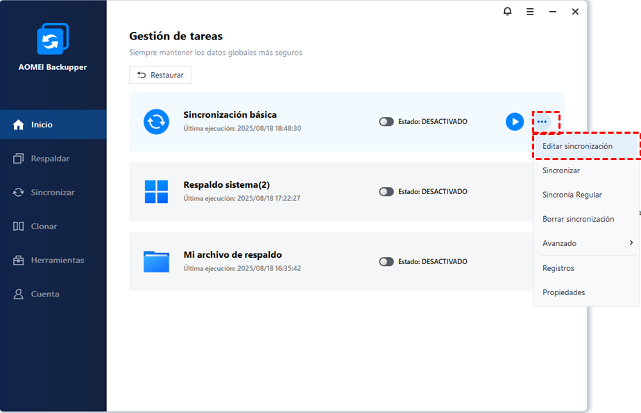 Todas las copias de seguridad creadas por AOMEI Backupper aparecen en la pestaña Inicio. Seleccione la copia de seguridad del sistema creada anteriormente, haga clic en el botón de tres líneas y seleccione Editar copia de seguridad. En la ventana emergente, haga clic en Esquema de copia de seguridad y establezca una política de retención de copias de seguridad para eliminar los archivos de copia de seguridad antiguos para su reutilización.