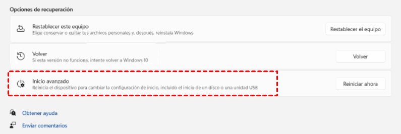 Pulsa la tecla Win + I para abrir la página de Configuración de Windows y selecciona Sistema > Recuperación. A continuación, en la ventana Recuperación, desplácese hasta Opciones de recuperación y seleccione Inicio avanzado > Reiniciar ahora.