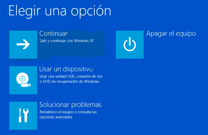 - La opción Solucionar problemas es la más utilizada y permite reiniciar el PC o utilizar otras opciones avanzadas, como Reparación de inicio, Restaurar sistema, Símbolo del sistema, etc.
