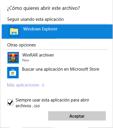 Paso 3. Selecciona Explorador de Windows de la lista. Marca Siempire usar esta aplicación para abrir archivos ISO y haz clic en Aceptar.