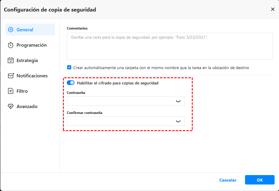 - Respaldo incremental: Es el método de copia de seguridad predeterminado en este software, que solo realiza copias de seguridad de los archivos que han cambiado desde la última copia de seguridad, lo que ahorra mucho espacio en disco y tiempo.