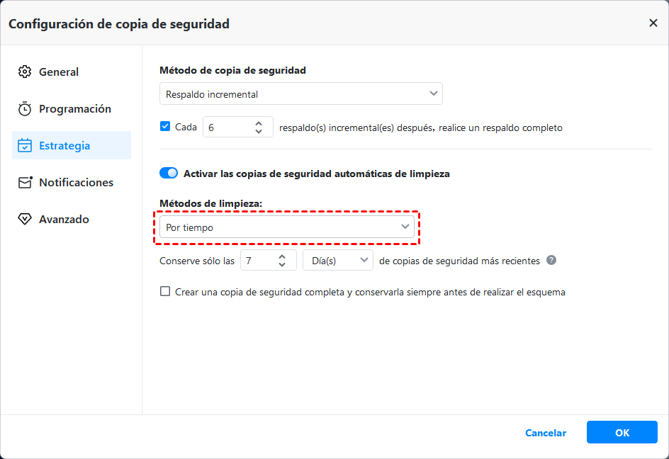 - Estrategia de respaldo: Una vez que habilitas la copia de seguridad programada en una tarea, realizará copias de seguridad solo de los archivos modificados con copias de seguridad incrementales después de la copia de seguridad completa. Además, en la versión premium, puedes probar el respaldo diferencial y la limpieza automática de copias de seguridad. Esta última función consiste en eliminar automáticamente las imágenes de copia de seguridad, lo que resuelve por completo el problema de espacio en disco lleno.