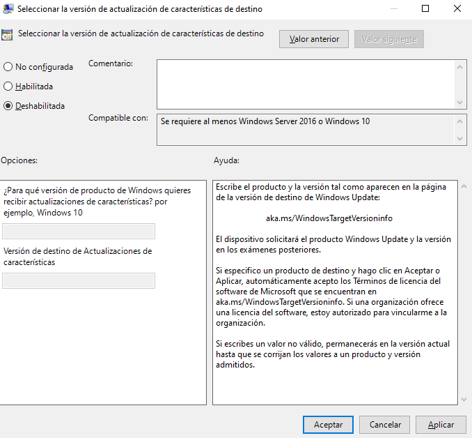 3. Desplázate hacia abajo hasta la sección "Opciones", establece "Windows 10" como la "Versión del producto" y "21H2" como la "Versión de destino de las actualizaciones de características". Luego, haz clic en "Aplicar" y luego en "Aceptar" para guardar los cambios y cerrar el cuadro de diálogo.