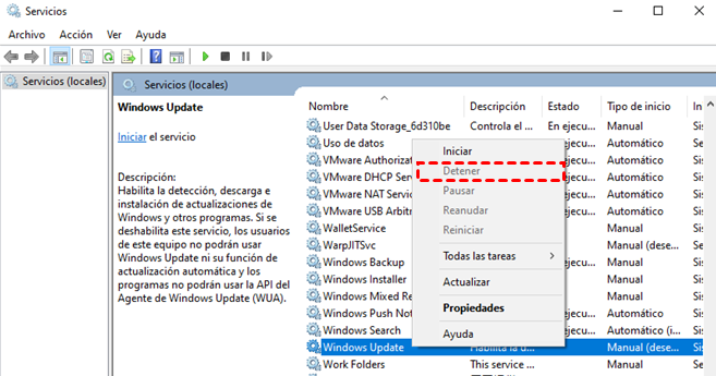 2. Navega hasta la opción "Windows Update", haz clic derecho sobre ella y selecciona el botón "Detener".