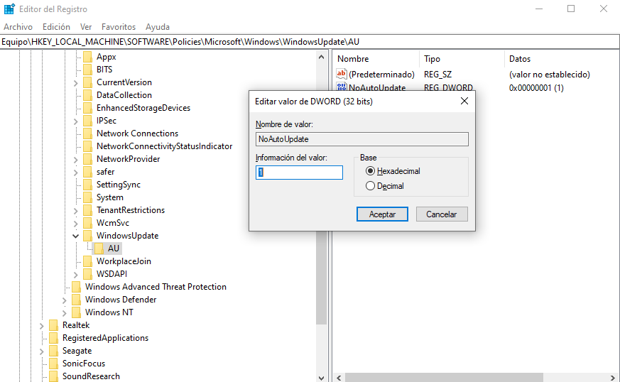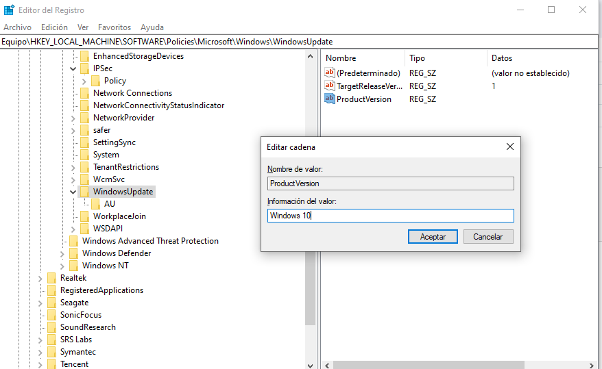 Además de la política o configuración de registro "TargetReleaseVersion", también puedes intentar utilizar "NoAutoUpdate" en el Editor del Registro.