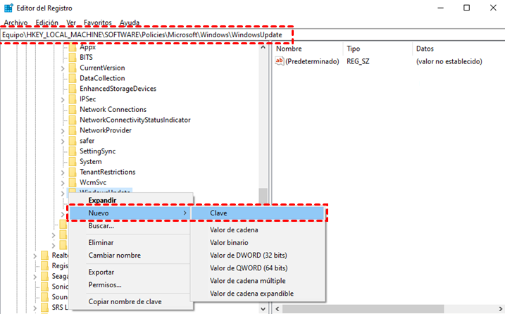 1. Escribe "regedit" en la ventana Ejecutar y presiona "Aceptar" para abrir el Editor del Registro. Luego, navega a la siguiente ruta, haz clic derecho en ella, selecciona Nuevo > Clave y nómbrala "AU".