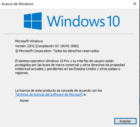 La última versión de Windows 10 es la 21H2. Sin embargo, antes de comenzar, debes verificar si tu computadora está utilizando esta versión. Escribe "winver" en la ventana Ejecutar y haz clic en "Aceptar" para confirmarlo. Luego verás la versión actual de Windows, que en este caso es la 21H2.