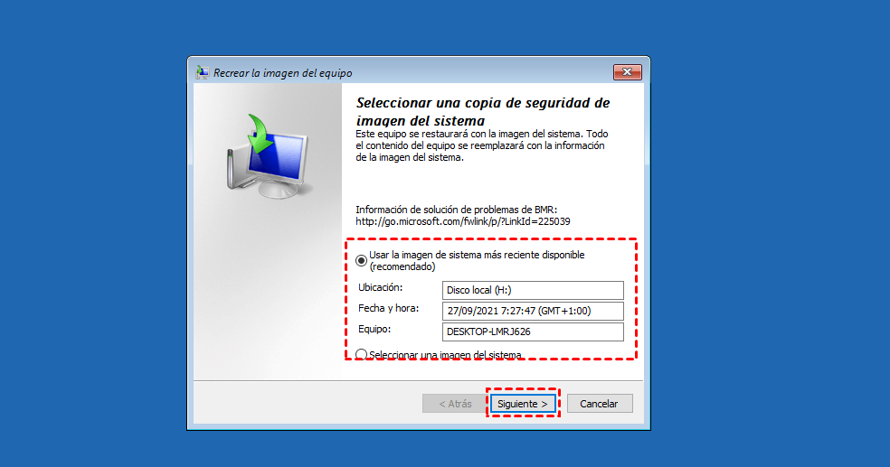Paso 4. En la ventana de reimagen del equipo, elija Usar la imagen de sistema más reciente disponible y luego haga clic en Siguiente.