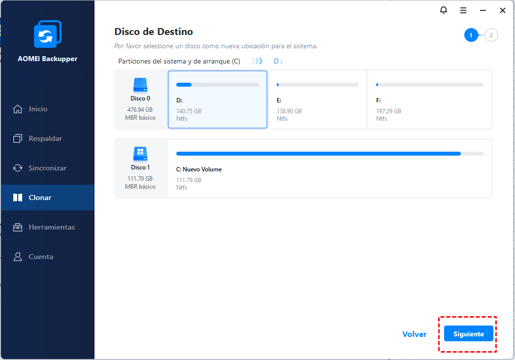 2. Sólo tiene que seleccionar el SSD como la nueva ubicación, y luego haga clic en "Siguiente" para continuar. Porque el programa está diseñado para seleccionar automáticamente la partición del sistema y las particiones relacionadas con el arranque para usted.