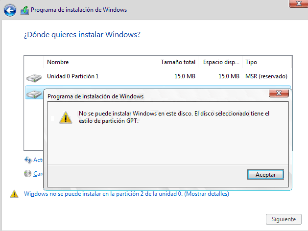 Para el primer error, puede ser causado por un modo de arranque incorrecto. Tu ordenador solo admite BIOS Legacy en lugar de arrancar tanto Legacy como UEFI, y la BIOS tradicional solo puede arrancar desde un disco MBR, por lo que solo puedes instalar Windows 10 en un segundo disco duro con MBR. Para resolverlo, podrías considerar convertir GPT a MBR antes de ejecutar la instalación de Windows.