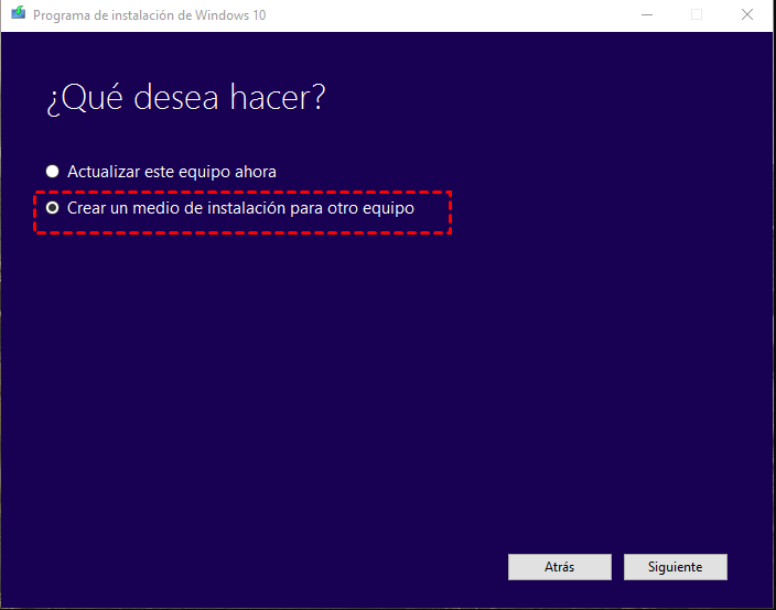 Descargue la herramienta de creación de medios de Windows 10, iníciela y seleccione la opción "Crear medios de instalación (unidad flash USB, DVD o archivo ISO) para otro equipo" y siga el asistente para crear medios de instalación.