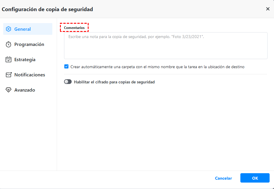 ▶ Opciones: Puedes escribir comentarios para la imagen del sistema para distinguirla de otras tareas de respaldo, comprimir, cifrar (compatible con la versión Professional) y dividir archivos de imagen, entre otras opciones.