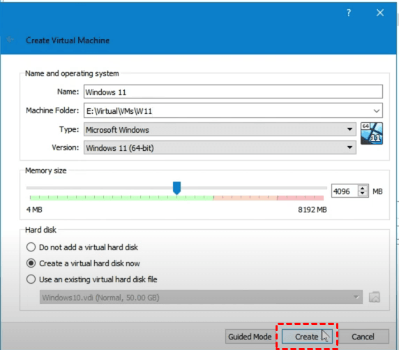 4. A continuación, deberás crear el Disco Duro Virtual, cuyos requisitos para Windows 11 son de 64 GB de espacio en disco. Haz clic en "Crear" (Create).
