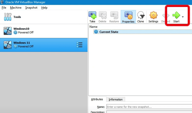 5. La máquina virtual ha sido creada. Ahora estamos listos para iniciar nuestra nueva máquina virtual e instalar Windows 11. En VirtualBox, haz clic en "Iniciar" (Start) para iniciar tu nueva VM. VirtualBox te solicitará un disco de inicio.