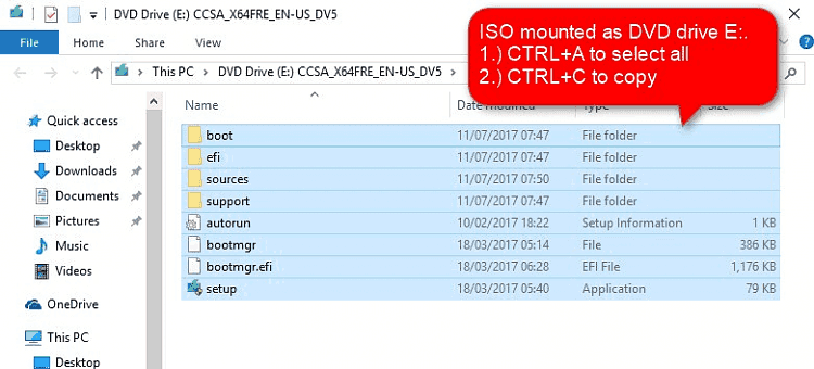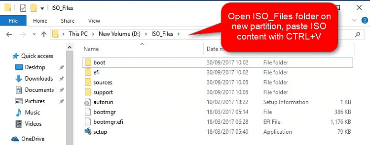 Paso 3. Monta la imagen ISO descargada como un DVD virtual haciendo doble clic sobre ella. Abre la ISO montada en el Explorador de archivos, selecciona todos los archivos y carpetas con CTRL + A, cópialos con CTRL + C y pega el contenido de la ISO en la carpeta Archivos_ISO de la nueva partición que acabas de crear.