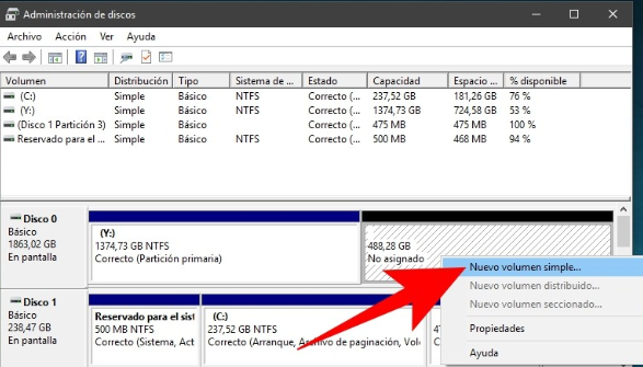 - Haga clic con el botón derecho en la nueva partición y seleccione Nuevo volumen simple.