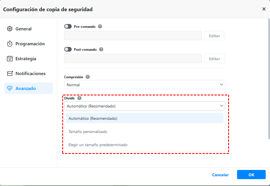 📌 Estrategia: Te permite elegir el método de copia de seguridad entre copias completas, incrementales o diferenciales. También puedes establecer reglas para eliminar automáticamente copias de seguridad antiguas, de manera que haya suficiente espacio en tu ubicación de copias de seguridad. Ten en cuenta que "Respaldo diferencial" y "Limpieza automática de copias de seguridad" solo son compatibles con versiones avanzadas como AOMEI Backupper Professional.