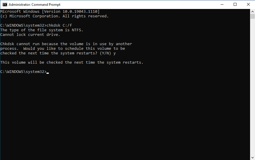 - En la ventana del Símbolo del sistema, escribe chkdsk C: /f y presiona Enter para ejecutar el comando. Para verificar todas las demás particiones de unidades, reemplaza la letra de unidad "C" con la letra correspondiente.