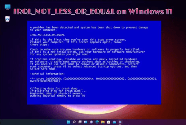 Los errores de pantalla azul (BSOD) son comunes en Windows, y es posible que también te encuentres con ellos en Windows 11. Uno de ellos es el error de pantalla azul IRQL_NOT_LESS_OR_EQUAL. El código de detención de Windows IRQL_NOT_LESS_OR_EQUAL es un problema relacionado con la memoria que ocurre cuando un proceso del sistema o un controlador de dispositivo necesita acceder a una dirección de memoria pero no tiene permiso para hacerlo. IRQL representa el nivel de solicitud de interrupción y NOT_LESS_OR_EQUAL define el nivel límite más allá del valor.