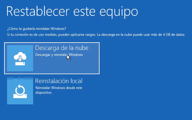 - A continuación, Windows 11 te pregunta cómo deseas reinstalarlo durante el proceso de restablecimiento. Puedes elegir una de las dos formas.