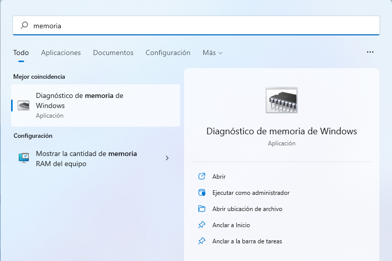 - Escribe "memoria" en el menú de inicio y haz clic en "Diagnóstico de memoria de Windows" en los resultados de búsqueda.