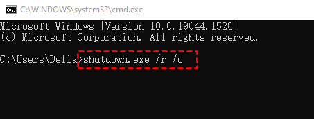 2. En la ventana Símbolo del sistema, escriba el comando shutdown.exe /r /o y pulse Intro para ejecutarlo.