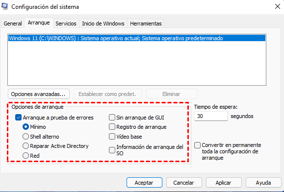 2. En la ventana Configuración del sistema, cambie a la pestaña Arranque, marque la opción Arranque a prueba de errores y haga clic en Aceptar.
