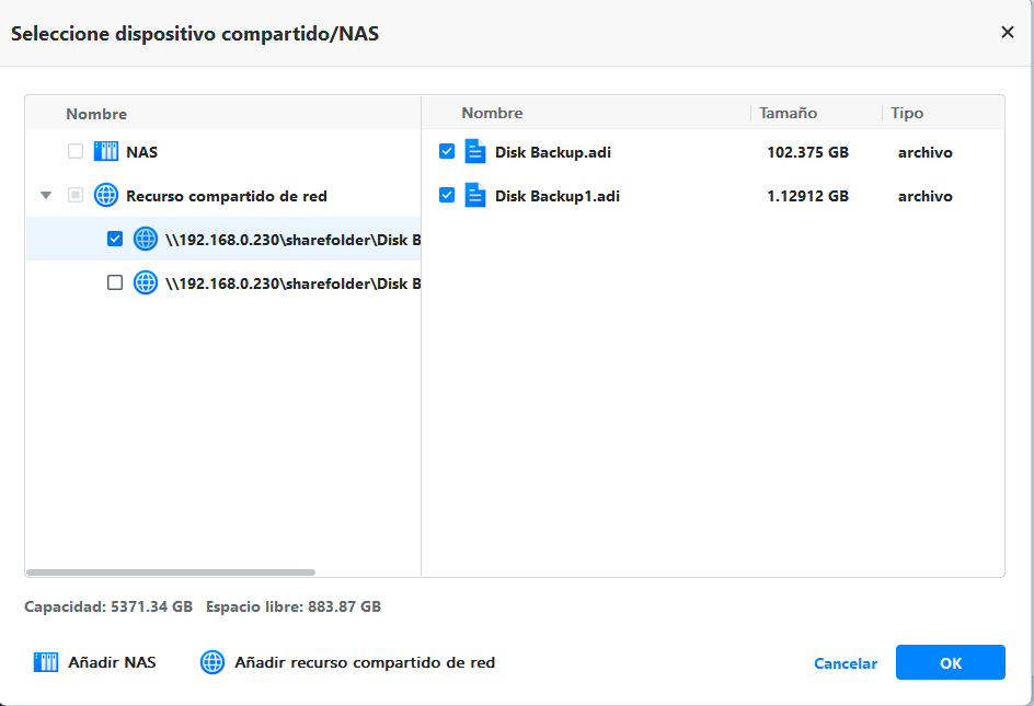 2. Navegue hasta la imagen del sistema que creó anteriormente. Si está en una ubicación de red, haga clic en Share/NAS y luego en Añadir ubicación de red para localizar la imagen.