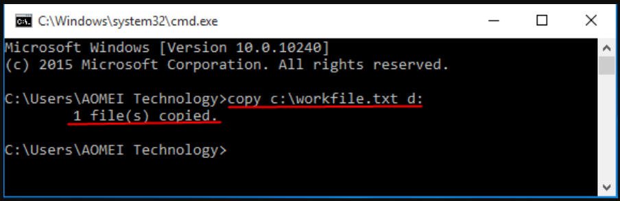 - Para copiar el archivo "workfile.txt" en la raíz de la unidad C a la unidad D , escriba el comando "copy c: \archivodetrabajo.txt d:".